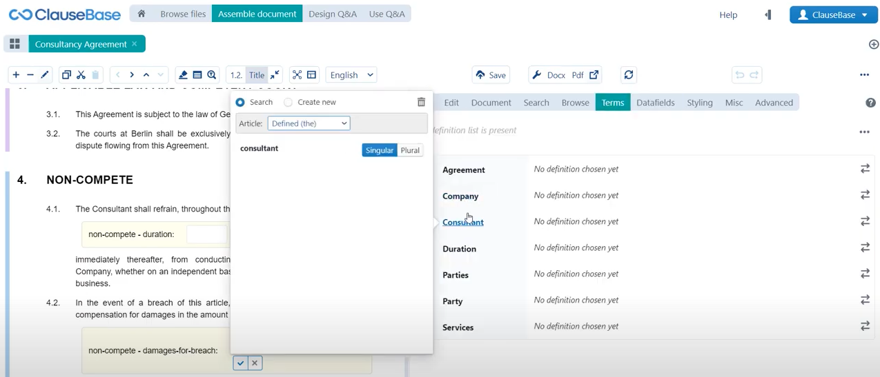 You can see here that the clause itself says that the consultant agrees to perform the services. If we now go to the terms menu and indicate that we want the plural version of the consultant, then not only do we now refer to the consultants agree to perform the services, but even this possessive form at the start of the sentence the consultant’s provision, has been changed to its plural version. So if we switch back for example to the singular version, you can see that it says the consultant apostrophe S, but if we switch to the plural version then it says consultants apostrophe. &#x20;
