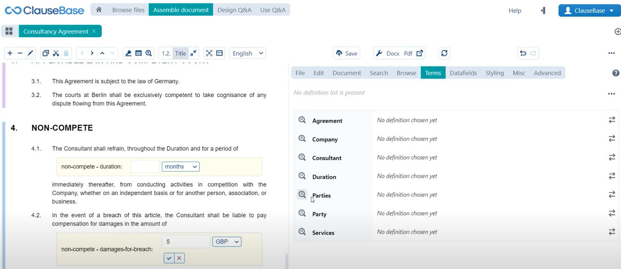 The conditional logic that we looked at in previous chapters should primarily be used to create legal nuance. Most document automation tools will also have you use this kind of conditional logic to affect grammatical changes, for example when a word needs to be changed from its singular version to its plural version. In Clause9 that's not necessary, you can use the flexible terminology that you created with the help of your concepts, to also create flexible grammar.
