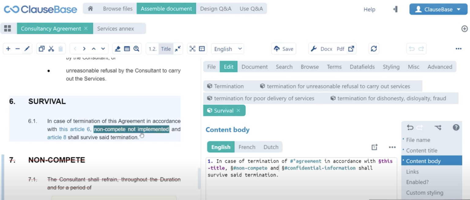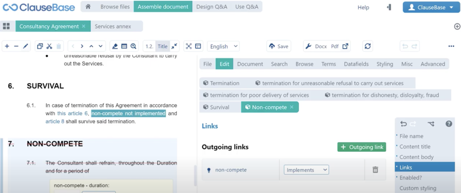 Now, the way that this condition works is essentially we are asking Clause9 is the concept of non-compete implemented anywhere in this document, i.e is there any clause in the document that specifically has that implementation link to the concept of non-compete. If that is the case, then we make the cross-reference to the article containing the non-compete and also the word “and” because we are referring to a second cross-reference right after. Now you can see nothing really changes because our non-compete has already been activated, but if we turn this condition off, if we indicate that the non-compete is not included in the list of optional clauses, then all of a sudden this cross-reference is dropped and those are the two special functions for this chapter.
